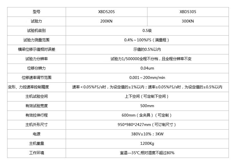 產品型號:XBD5205、XBD5305設備主要功能:本設備適用于對金屬材料、非金屬材料及復合材料的力學性能的測試以及工藝性能的分析研究。配上相應的工裝,可做拉伸、壓縮、彎曲、剪切、撕裂、剝離、頂破、疲勞等試驗。可自動求取試驗承受力值、斷裂力值、伸長率、抗拉強度、屈服強度、抗壓強度、彈性模量、剪切強度、撕裂強度、剝離強度等參數。同時也可實現定伸長應力、定應力伸長、載荷保持等要求的測試。該機廣泛應用于建筑建材、航空航天、機械制造、電線電纜、橡膠塑料、汽車制...">